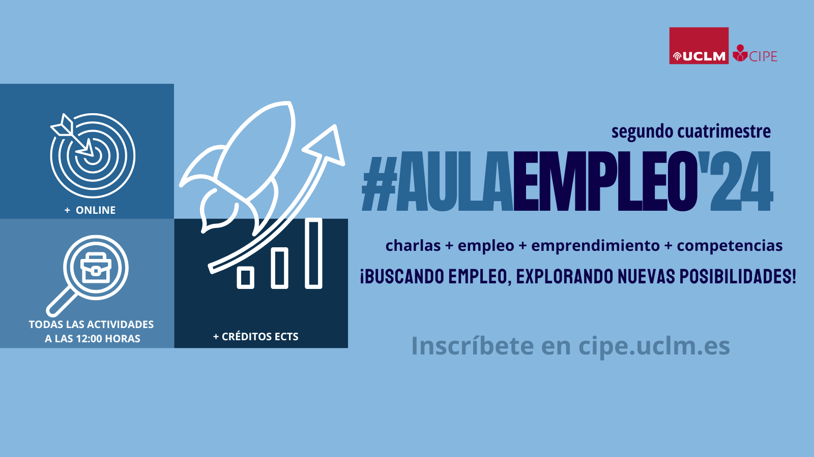 #Aulaempleo24 dará su pistoletazo de salida este mes de febrero en la Universidad de Castilla-La Mancha, con el claro objetivo de potenciar, mejorar y ampliar el posicionamiento profesional de estudiantes y egresados/as en el mundo laboral.