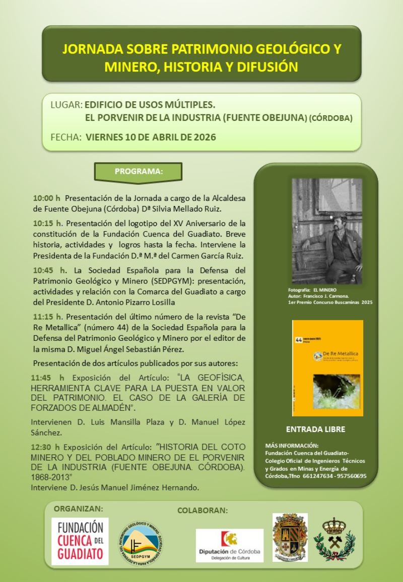Cartel oficial de la Jornada sobre Patrimonio Geológico y Minero, Historia y Difusión. Viernes 10 de abril de 2026. El Porvenir de la Industria, Fuente Obejuna (Córdoba). Crédito de imagen: EL MINERO. Autor: Francisco J. Carmona (1er Premio Concurso Buscaminas 2025).